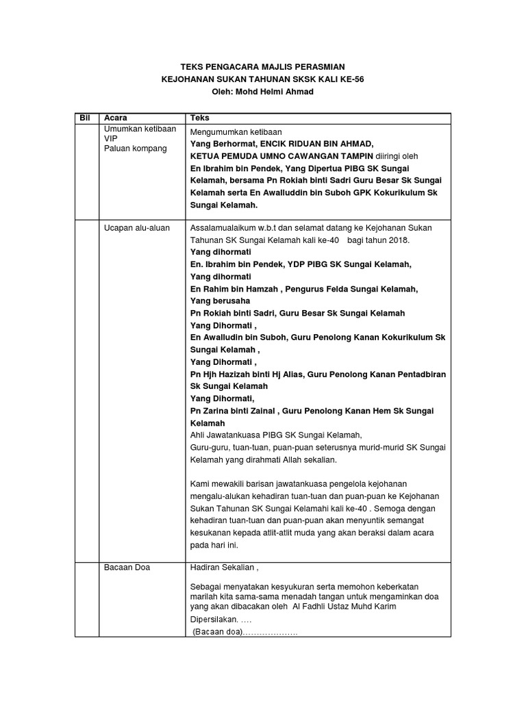 Teks pengerusi majlis masa perkara 800 pm. Teks pengacara majlis penutupan kejohanan sukan prestasi. Teks doa majlis rasmi hari guru pdf.